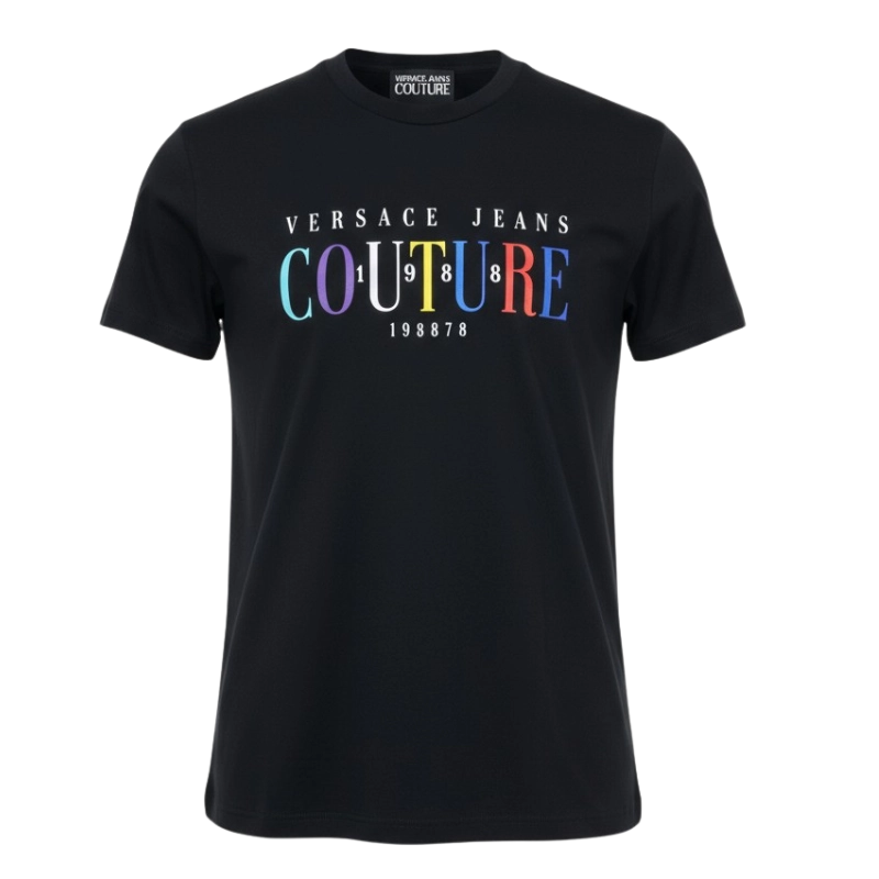 Front centre: “VERSACE JEANS COUTURE” branding in a colourful gradient or block-colour logo print for maximum visual impact.