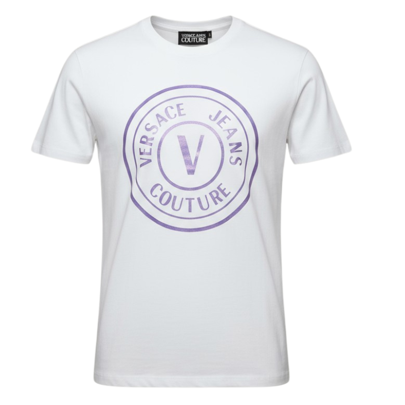 • Front-centre: metallic logo print “VERSACE JEANS COUTURE” (or “V-Emblem” variant) in eye-catching metallic foil or print.